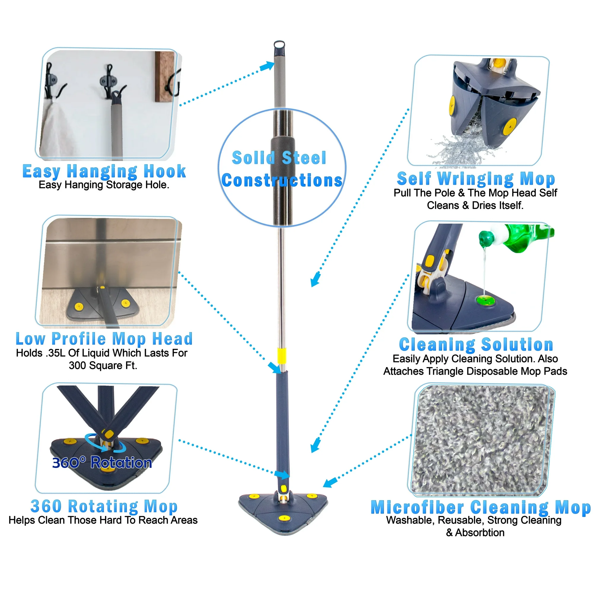 SELF WRINGING TRIANGLE MOP: Enjoy a cleaner and healthier way of mopping with this flat mop’s self-wringing hands free cleaning mechanism. Simply slide the bar up and down to wring water and dirt without ever touching the mop. Say goodbye to smelly string mops and disposable mop pads. Wash, rinse, and dry all in one easy process.